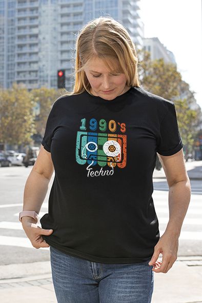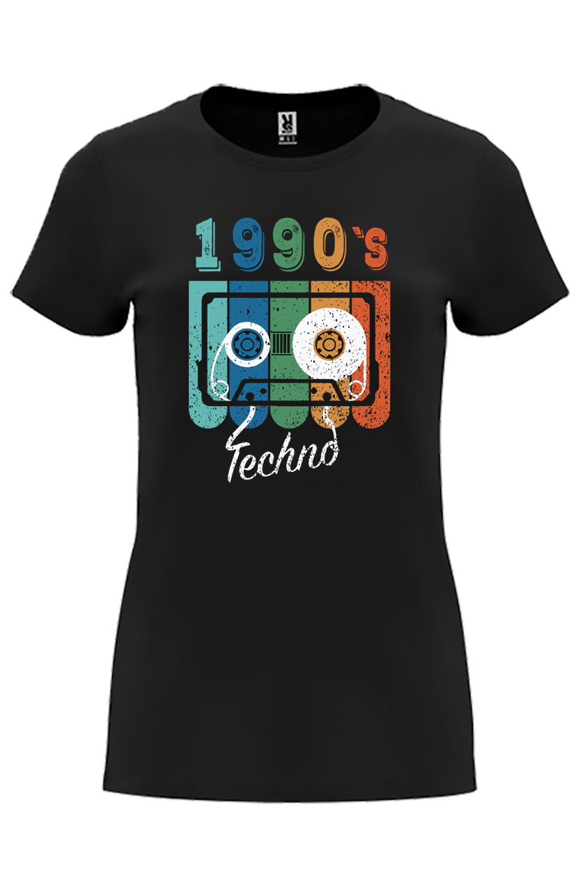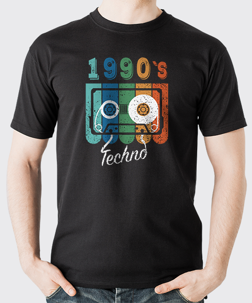 Revive la esencia de los años 90 con esta camiseta retro de estilo único. Su diseño presenta una vibrante ilustración de una cinta de cassette en tonos azul, verde, naranja y blanco, acompañada del texto «1990’s Techno» en una tipografía vintage. Perfecta para los amantes de la música electrónica y nostálgicos de la época dorada del techno.