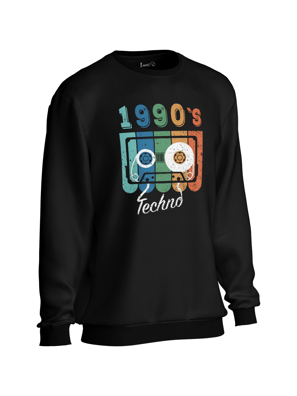 Revive la esencia de los años 90 con esta sudadera retro de estilo único. Su diseño presenta una vibrante ilustración de una cinta de cassette en tonos azul, verde, naranja y blanco, acompañada del texto «1990’s Techno» en una tipografía vintage. Perfecta para los amantes de la música electrónica y nostálgicos de la época dorada del techno.